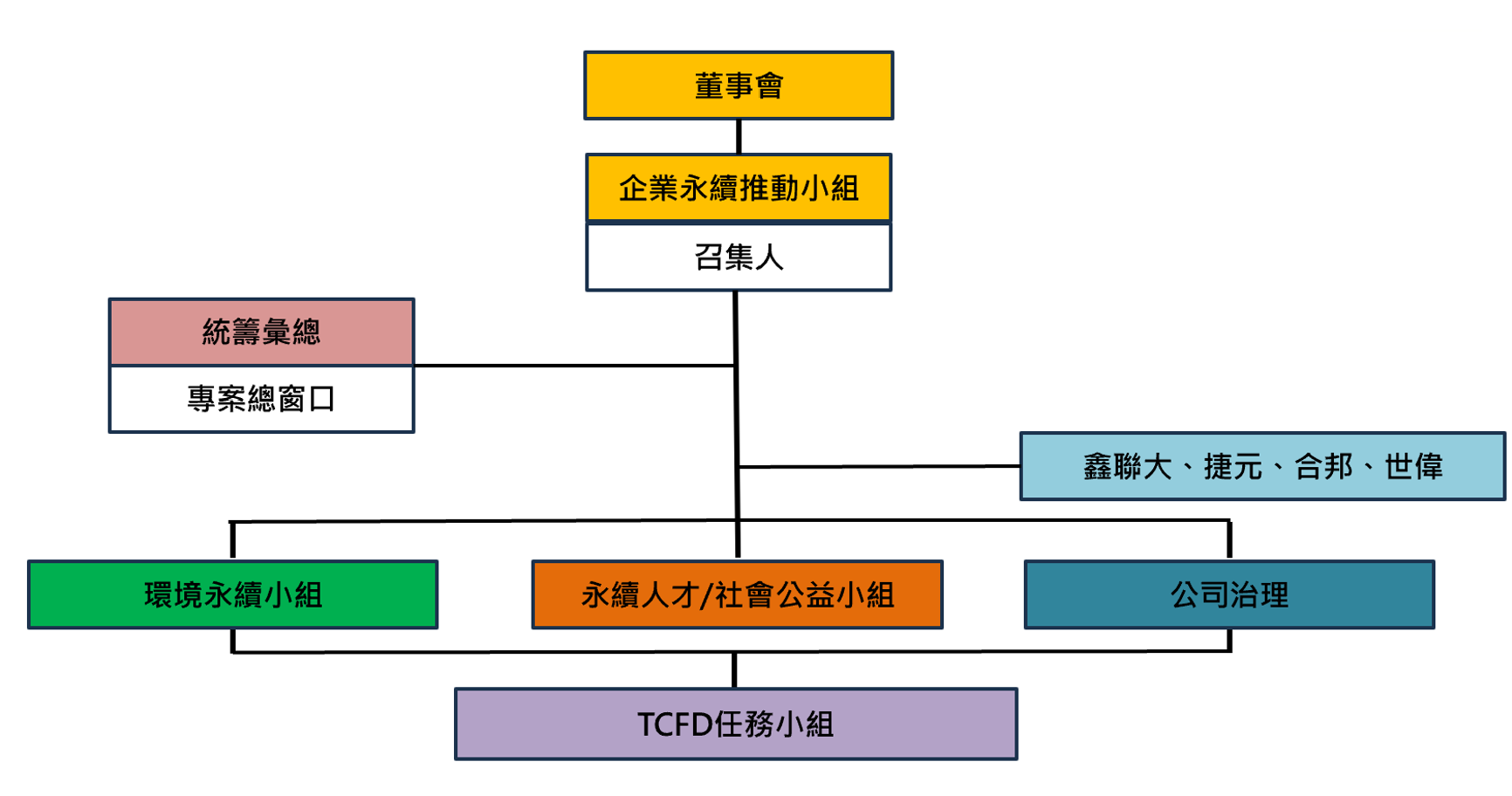 本公司為落實執行企業永續作業,由鑫聯大控股總經理擔任召集人,共同與期下子公司共組企業永續推動小組,推動集團永續目標之設定與執行具體行動計畫,並將ESG 概念融入經營策略中,展現永續經營之決心。每年定期(至少一年一次)提報董事會,向董事會呈報ESG 執行計畫及推動成果。